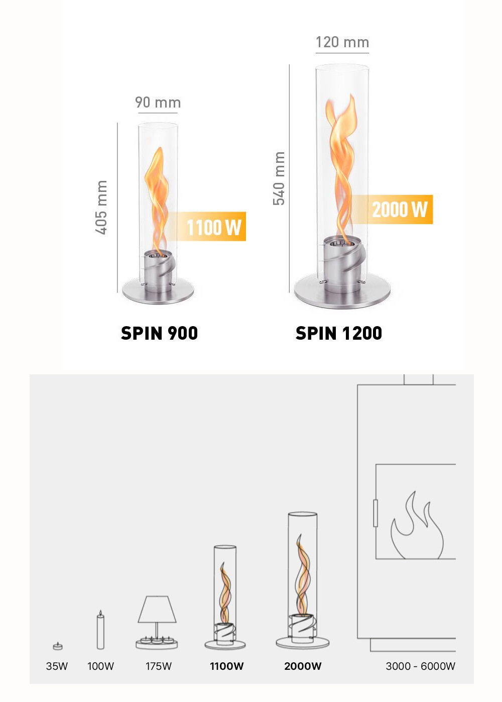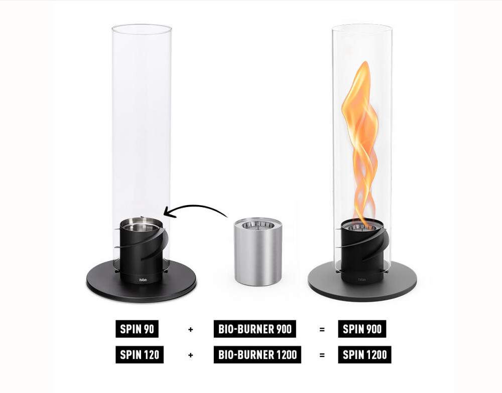 SPIN 900 | 1200의 심장은 특허받은 바이오 버너입니다. 정교한 버너 기술 덕분에 대낮에도 보이는 밝고 독특한 불꽃을 만들어냅니다. 밀폐된 바이오 버너는 안전 밸브를 통해 Liquid 연료 바이오 에탄올을 안전하게 채울 수 있으며 1.5시간 이상 태우게 됩니다. Eco-Ring을 착용하면 화염의 높이와 연소 시간을 조절할 수 있어 연소시간을 50% 더 높일 수 있습니다.