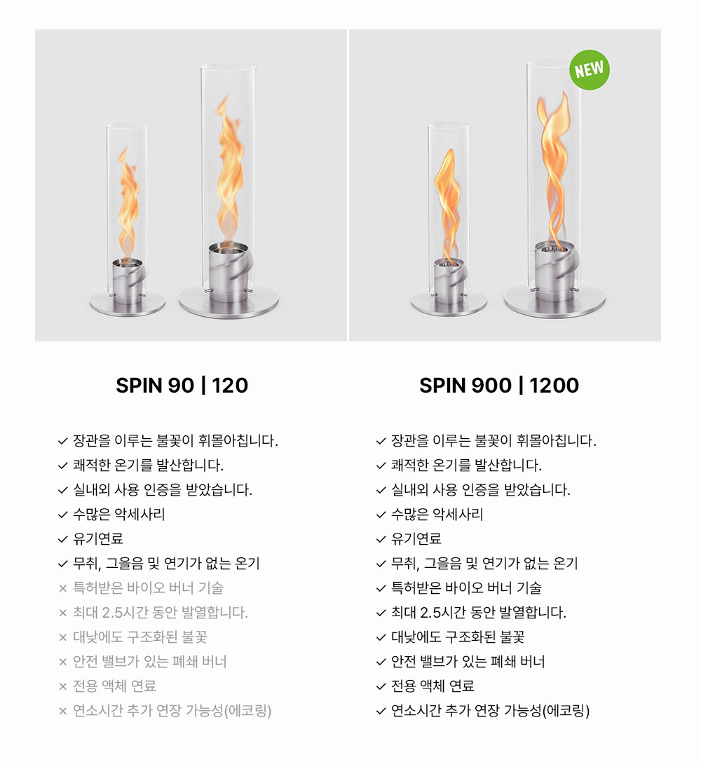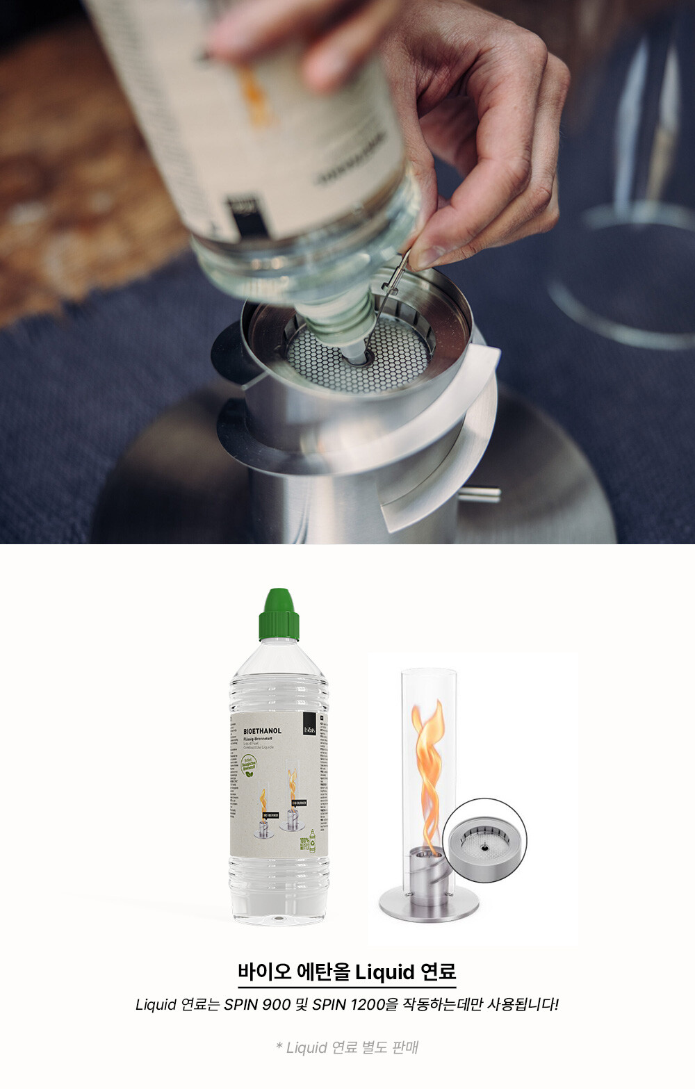 * 주의 : SPIN 900/1200 및 새로운 바이오 버너 900/1200으로 업그레이드된 모든 SPIN은 Liauid Fuel (액체 바이오에탄올 / 그린캡 ) 만 사용가능합니다. 젤형태의 바이오에탄올은 사용할 수 없습니다.