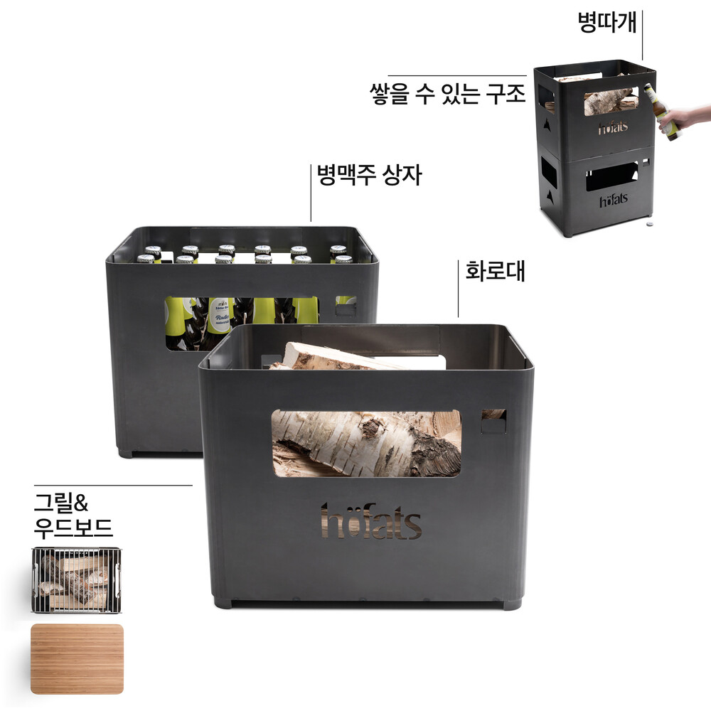 호파츠 비어 박스는 다양한 용도로 사용할 수 있는 다용도 바비큐 그릴 화로대입니다. 상자에 병이나 장작을 포장하여 간편하게 이동할 수 있습니다. 원하는 곳 어디에서나 불을 가져오세요. 혼자서 또는 가족이나 친구들과 캠핑을 갈 때 좋습니다. 특히 차박할 때 트렁크 공간을 효율적으로 사용하실 수 있습니다.