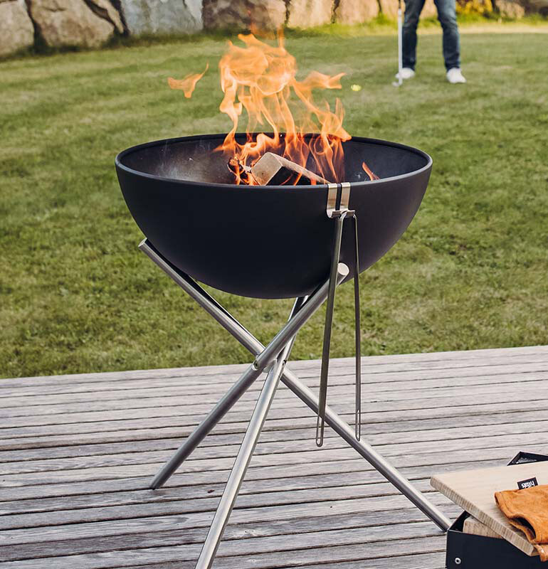 삼각대를 이용해서 스탠딩 파티를 시작할 수 있습니다. 엉덩이 높이로 올려 최적의 위치로 편하게 바비큐를 즐기실 수 있습니다.(그릴과 플란차 사용 가능, ※악세서리 별매). 안정적인 스탠드로 볼BOWL을 바로 놓거나 기울어지게 놓아도 안전하게 균형을 잡으며 걱정 없이 불을 즐길 수 있게 해줍니다.