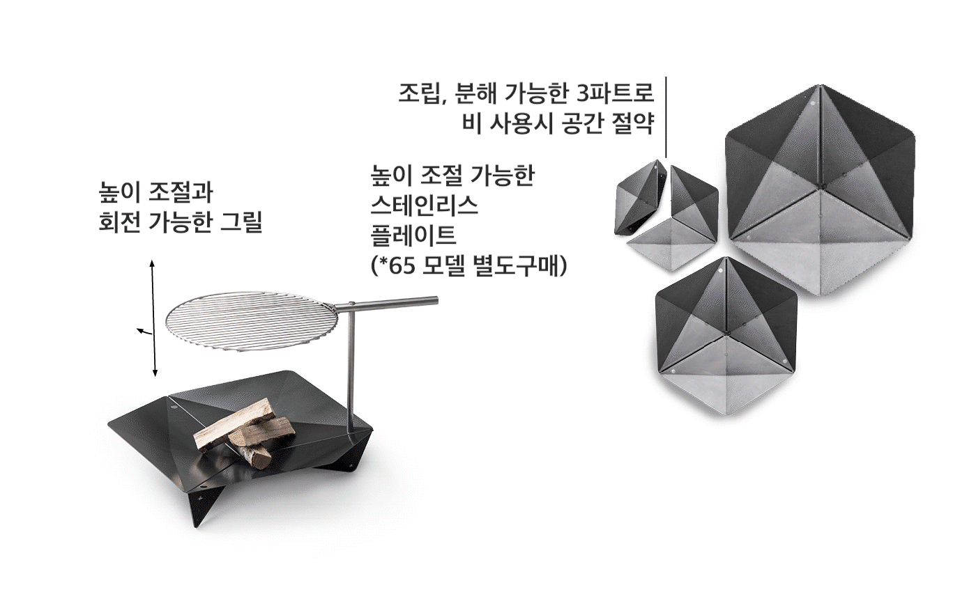 트리플(TRIPLE)의 육각형 디자인은 일반적인 화로대와 다른 모양으로 매력적입니다. 세 개의 동일한 형태의 파트를 빠르고 쉽게 결합하여 육각형을 형성할 수 있습니다. 트리플은 세 가지 크기로 제공됩니다. (국내에서는 65, 90 사이즈를 제공합니다.) 사이즈에 알맞는 올바른 액세서리를 선택하시고 바비큐를 즐겨보세요. 파티가 끝나면 트리플을 분해해서 3개의 파트를 쌓아서 옮길 수 있습니다. 정말 공간을 절약하면서 넓은 화로대의 모닥불을 즐길 수 있습니다.